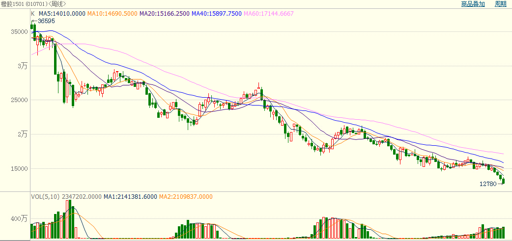 本周滬膠走勢(shì)延續(xù)前三周跌勢(shì),價(jià)格再創(chuàng)新低,主力合約跌破13000整數(shù)關(guān)口。近月合約1410價(jià)格收盤(pán)于11250,逼近11000,周跌505,跌幅為4.29%,1409周一以11775收盤(pán)完成全部交割。再看主力合約1501,本周開(kāi)盤(pán)13485,最高13750,最低12780,收盤(pán)12835,周跌685,跌幅為5.07%??偝謧}(cāng)為277072,較上周276098相差無(wú)幾??偝山涣繛?span lang="EN-US">234萬(wàn)手,較上周203萬(wàn)手有所提高。概括其表現(xiàn)為:前半周行情在13300上方震蕩欲反彈,但成交萎靡,量能不足。下半周則表現(xiàn)出反彈無(wú)力,行情繼續(xù)急劇下跌,周五更是逼近跌停的形勢(shì)收盤(pán)。其他月份合約均大幅下挫,跌幅均在5%左右,整體表現(xiàn)弱勢(shì)。