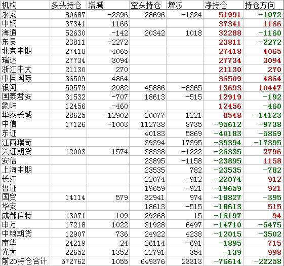 今日前20名機(jī)構(gòu)多頭總持倉572762手,增加多頭倉位1055手,空頭總持倉649376手,增加空頭倉位23313手,凈持倉偏空。多方前三名小幅減倉,其中多方第一主力永安期貨平掉多倉1072手,空方前三名主力加倉堅決,總共加33002手(如下圖,注:表格空白部分是持倉未進(jìn)入前20名)。
