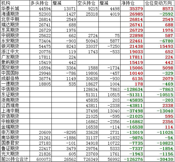如上圖所示(空格部分是持倉(cāng)未在前二十名,僅供參考),前20名多頭持倉(cāng)600073手,增倉(cāng)26562手;前20名空頭持倉(cāng)726349手,增倉(cāng)56992手。凈持倉(cāng)偏空,多空增倉(cāng)比為1:2.15。多方銀河期貨加凈多15493手,華泰長(zhǎng)城加凈多8573手,其它機(jī)構(gòu)變化不大??辗郊涌諉纹鞄悯r明,空方第一主力中信期貨今日繼續(xù)加空7863手,東證期貨、上海中期、中萬(wàn)期貨、國(guó)泰君安均加凈空過(guò)萬(wàn)。