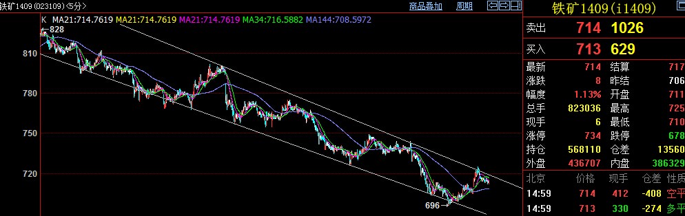 5月22日鐵礦石1409合約開盤后迅速拉漲,最高反彈至725(+19),午后漲幅收窄,報收于714(+8),幅度為1.13%,增倉1.35萬手,持倉56.8萬手。持倉前20名中,多頭持倉198793手(+10680),空頭持倉189451手(+26100),雖然依然多方占優(yōu),但優(yōu)勢正在削弱,值得關(guān)注是空頭第二名的永安期貨加空6710手總持倉22512手,但它仍為凈多頭,但凈多手數(shù)由昨日3665降至今日162手,另一個值得注意的是近期在黑色產(chǎn)業(yè)鏈上多次判斷準確的江西瑞奇,位列第十名加空2329手。