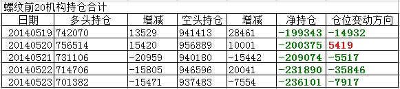螺紋凈持倉(cāng)偏空進(jìn)一步擴(kuò)大,到了上周五23日凈持倉(cāng)負(fù)值擴(kuò)大至23.6萬(wàn)。