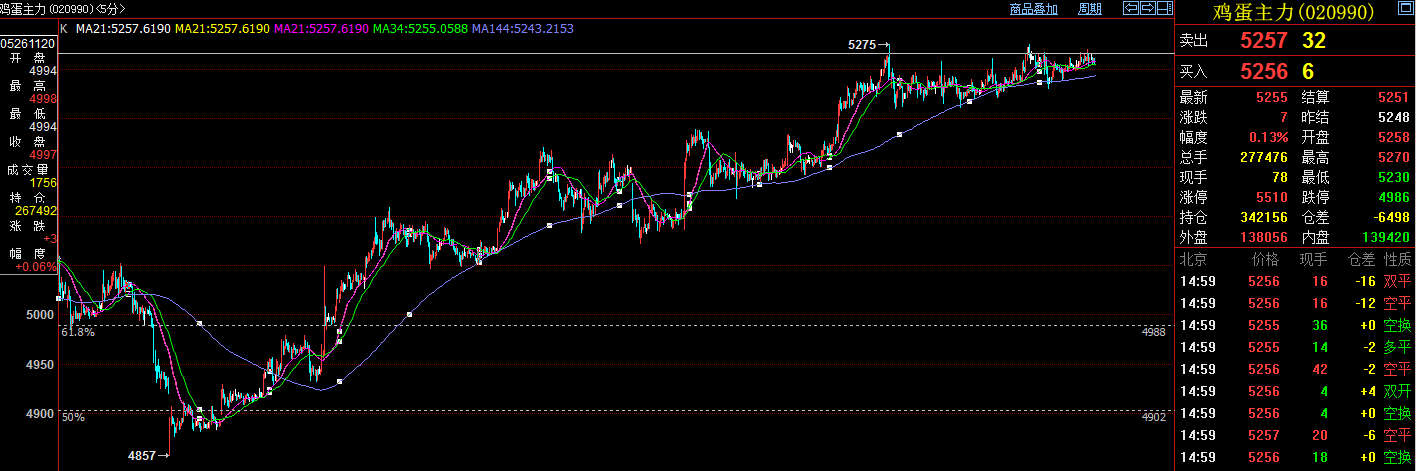 6月26日雞蛋1409主力合約開盤高開低走,開盤后最高上沖至5267,最低下探至5230,隨后拉升,震蕩逐步走高,最高拉升至5270點(diǎn),尾盤小幅下探,報(bào)收于5255(+7),漲幅0.13%。持倉方面,今日減倉6498手,持倉342156手。持倉前20名中,多頭持倉86725(-1742)手,空頭持倉76170(-624)手,多頭占優(yōu),其中多頭永安期貨11336手(+1066),多頭中糧期貨3638手(+1016),多頭增倉規(guī)模較大。