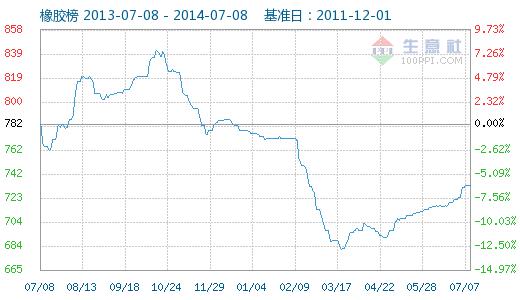 7月7日橡膠指數(shù)為733點,與上日持平,較周期內(nèi)最高點1129點(2012-03-05)下降了35.08%,較2014年03月20日最低點681點上漲了7.64%。(注:周期指2011-12-01至今)。