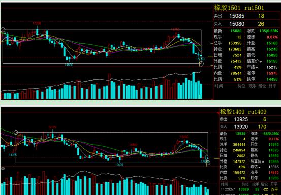 天膠1409 | 13985 | 13960 | 14025 | 13890 | 13930 | 13955 | -55 | 304444 | 246054 | 2862 | |