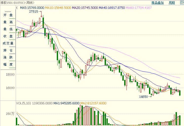 本周滬膠1501在外盤(pán)日膠有效擊穿200大關(guān),破位下行的帶動(dòng)下呈現(xiàn)急跌。技術(shù)面上符合前期預(yù)測(cè)繼續(xù)尋找底部的趨勢(shì),從周K線上分析,均線全部壓制在周K線上方,形成強(qiáng)烈的空頭趨勢(shì)。且本周現(xiàn)貨價(jià)格在期貨行情下跌的帶動(dòng)下紛紛下調(diào)報(bào)價(jià),但市場(chǎng)成交清淡。