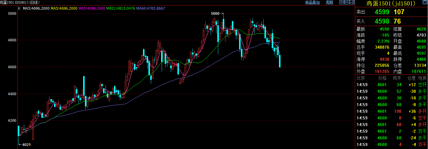 8月19日雞蛋1501主力合約低開后大幅下滑,在4630一線弱勢震蕩運行,午后繼續(xù)弱勢下行,尾盤下探到最低點,報收于4598點(-105),跌幅高達-2.23%。今日行情下跌動能強勁,下跌趨勢明顯。持倉方面,今日增倉13134手,持倉225056手。持倉前20名中,多頭持倉58679(+4309)手,空頭持倉55477(+3239)手,多頭占優(yōu)。