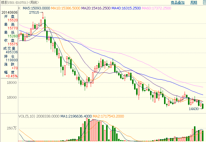 技術(shù)面上看橡膠1501合約,隨著本周應(yīng)聲而下的長陰線侵吞上周小陽線后,橡膠1501合約重心再度下移,本周價格已創(chuàng)新低14430,逼近近5年低點。但成交量仍然較為低靡。與去年同期相比,本月橡膠1501合約8月份的四周的周成交量均低于去年同期成交量,約為去年成交量的一半左右,表明多空信心均未十分充足。