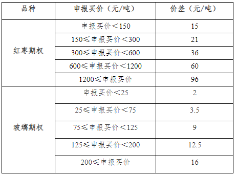 紅棗、玻璃期權合約最優(yōu)買賣報價價差小于等于下表價差時,不得詢價。