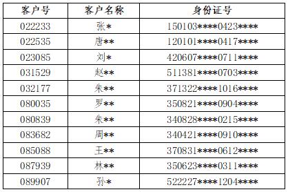 根據(jù)《金融機構(gòu)客戶身份識別和客戶身份資料及交易記錄保存管理辦法》第十九條“客戶先前提交的身份證件或者身份證明文件已過有效期的,客戶未在合理期限內(nèi)更新且沒有提出合理理由的,金融機構(gòu)應中止為客戶辦理業(yè)務”的規(guī)定,鑒于下述賬戶因客戶意愿或留存的聯(lián)系電話暫停使用仍未能進行有效證件的更新,我司將對如下逾期無法提交最新的有效身份證件的客戶進行賬戶限制處理。