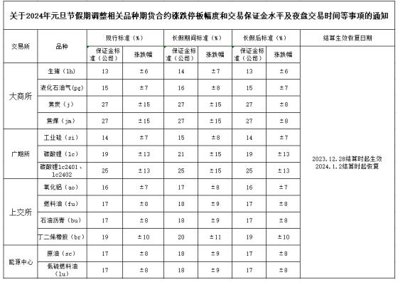 關于2024年元旦節(jié)假期調整相關品種期貨合約漲跌停板幅度和交易保證金水平及夜盤交易時間等事項的通知