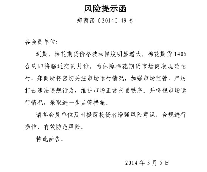 您的位置:首頁(yè)--公司簡(jiǎn)介--交易風(fēng)險(xiǎn)提示轉(zhuǎn)發(fā)鄭州商品交易所《風(fēng)險(xiǎn)提示函》