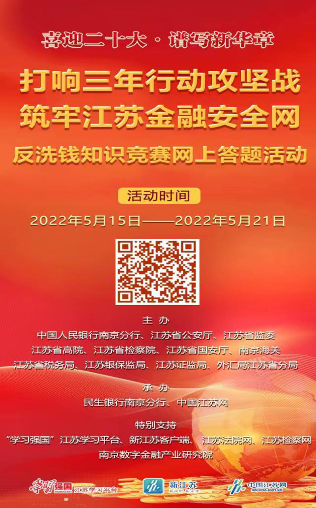 為持續(xù)增強(qiáng)社會公眾洗錢風(fēng)險防范意識,營造熱烈濃厚的反洗錢社會氛圍,凝聚打擊治理洗錢違法犯罪三年專項行動合力,在反洗錢領(lǐng)域為譜寫“強(qiáng)富美高”江蘇現(xiàn)代化建設(shè)新篇章貢獻(xiàn)力量。人民銀行南京分行、江蘇省公安廳、江蘇省監(jiān)委、江蘇省高院、江蘇省檢察院、江蘇省國安廳、南京海關(guān)、江蘇省稅務(wù)局、江蘇銀保監(jiān)局、江蘇證監(jiān)局、外匯局江蘇省分局通過“學(xué)習(xí)強(qiáng)國”江蘇學(xué)習(xí)平臺、新江蘇客戶端、中國江蘇網(wǎng)等江蘇省內(nèi)主流媒體矩陣,共同舉辦“喜迎二十大·譜寫新華章——打響三年行動攻堅戰(zhàn),筑牢江蘇金融安全網(wǎng)”反洗錢知識競賽網(wǎng)上答題活動。