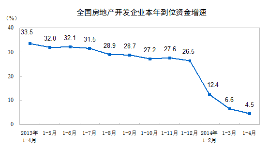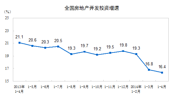 2014年1-4月份,全國(guó)房地產(chǎn)開發(fā)投資22322億元,同比名義增長(zhǎng)16.4%,增速比1-3月份回落0.4個(gè)百分點(diǎn)。其中,住宅投資 15299億元,增長(zhǎng)16.6%,增速回落0.2個(gè)百分點(diǎn),占房地產(chǎn)開發(fā)投資的比重為68.5%。