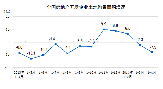1-4月份,房地產(chǎn)開發(fā)企業(yè)土地購置面積8130萬平方米,同比下降7.9%,降幅比1-3月份擴(kuò)大5.6個(gè)百分點(diǎn);土地成交價(jià)款2214億元,增長(zhǎng)9.6%,增速回落1.8個(gè)百分點(diǎn)。