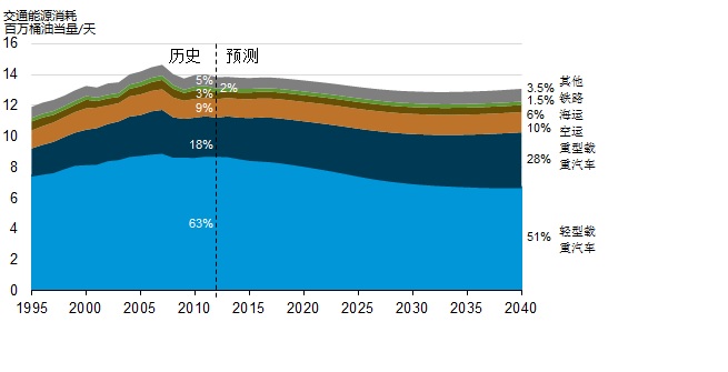 交通能源消耗,包括來自輕、重型車輛,飛機(jī)空運(yùn),輪船海運(yùn),鐵路運(yùn)輸?shù)炔煌\(yùn)輸工具在不同運(yùn)輸方式下產(chǎn)生的能源消耗。在美國,2007年交通運(yùn)輸?shù)哪茉葱枨罅孔畲?,達(dá)到14.6百萬桶油當(dāng)量每天,2012年交通勻速的能源需求量達(dá)到13.8百萬桶油當(dāng)量每天。2012年,輕型載重車輛能源消耗量占交通運(yùn)輸全部能源消耗量的63%,到2040年這一比例有望降到51%。重型載重車輛的能源消耗比例可能從目前的18%上升到2040年的28%。輕型車輛的能源消耗未來下降主要得益于車輛能源效率的改善。