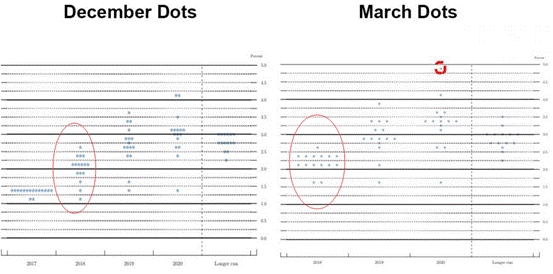 (圖為去年12月點(diǎn)陣圖與3月點(diǎn)陣圖對(duì)比圖片來(lái)源:Zerohedge、FX168財(cái)經(jīng)網(wǎng))